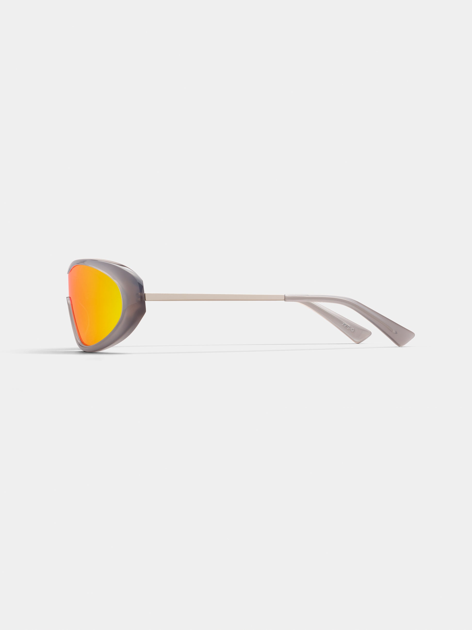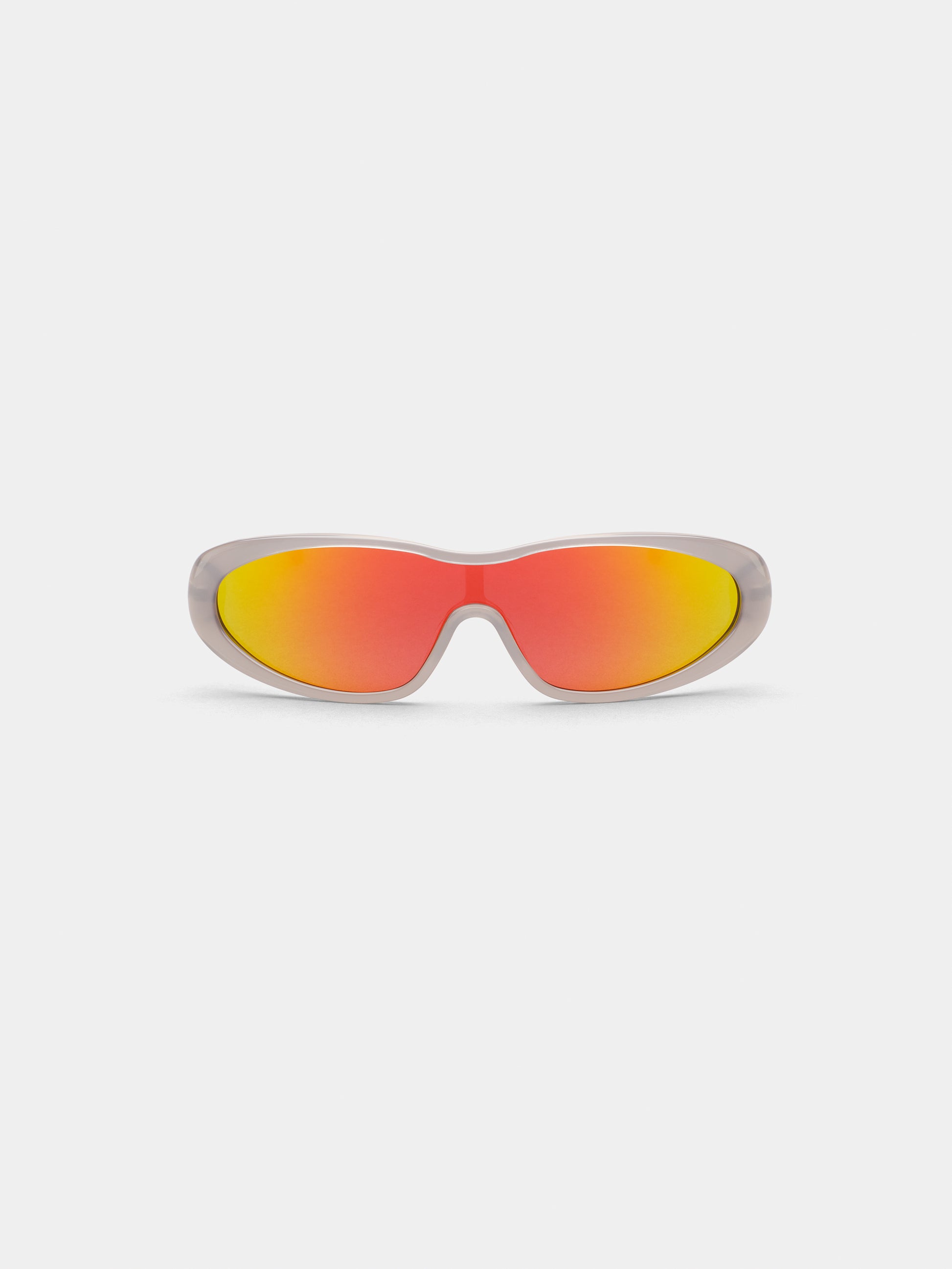 Ultre is a bold shield-style frame that fuses sport and futurism with unapologetic flair. In silver grey, milky pearl acetate wraps around mirrored red lenses—delivering next-level heat with a silhouette that turns heads with futuristic force.